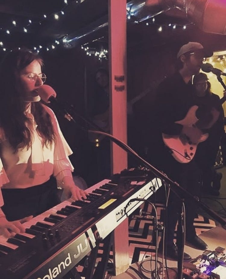And here’s where we are today! I’m mostly lead vocals now, except on a few songs where Ian sings lead. It’s been a fun challenge for me to step out from behind the keys and feels more like home than I expected it to. Ian and I are still writing all the songs, although there have been some fun post-rehearsal jams recently, so we are exploring a change in that dynamic. Charlie has started adding some backing vocals to a couple things recently—excited for you to hear the recordings when they come out. For the performance pictured above, Charlie subbed for Ian on the songs where he sings lead, as Ian recently had vocal surgery for a nodule (doing great now!).
